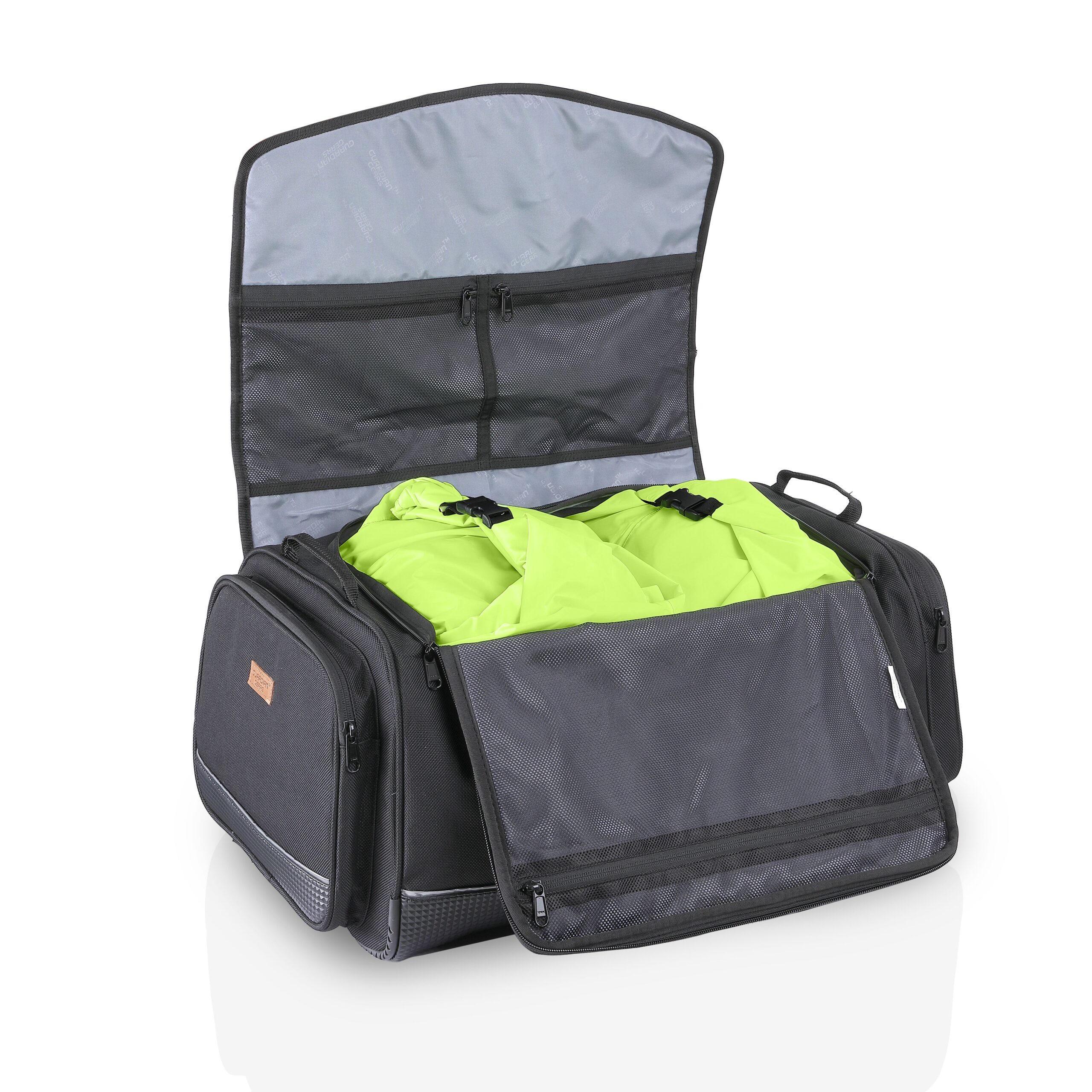 Made from Industrial Grade, Durable, Highly Abrasion Resistant 1200 x 1200 Double PVC Coated Imported Polyester Fabric. This makes this bag the toughest bag available in the market. Total Capacity 60Ltrs. Original YKK Zippers & YKK Pullers Original PVC coated 3M Reflective Tape. Durable & Robust Fittings. High tensile seat-belt.
